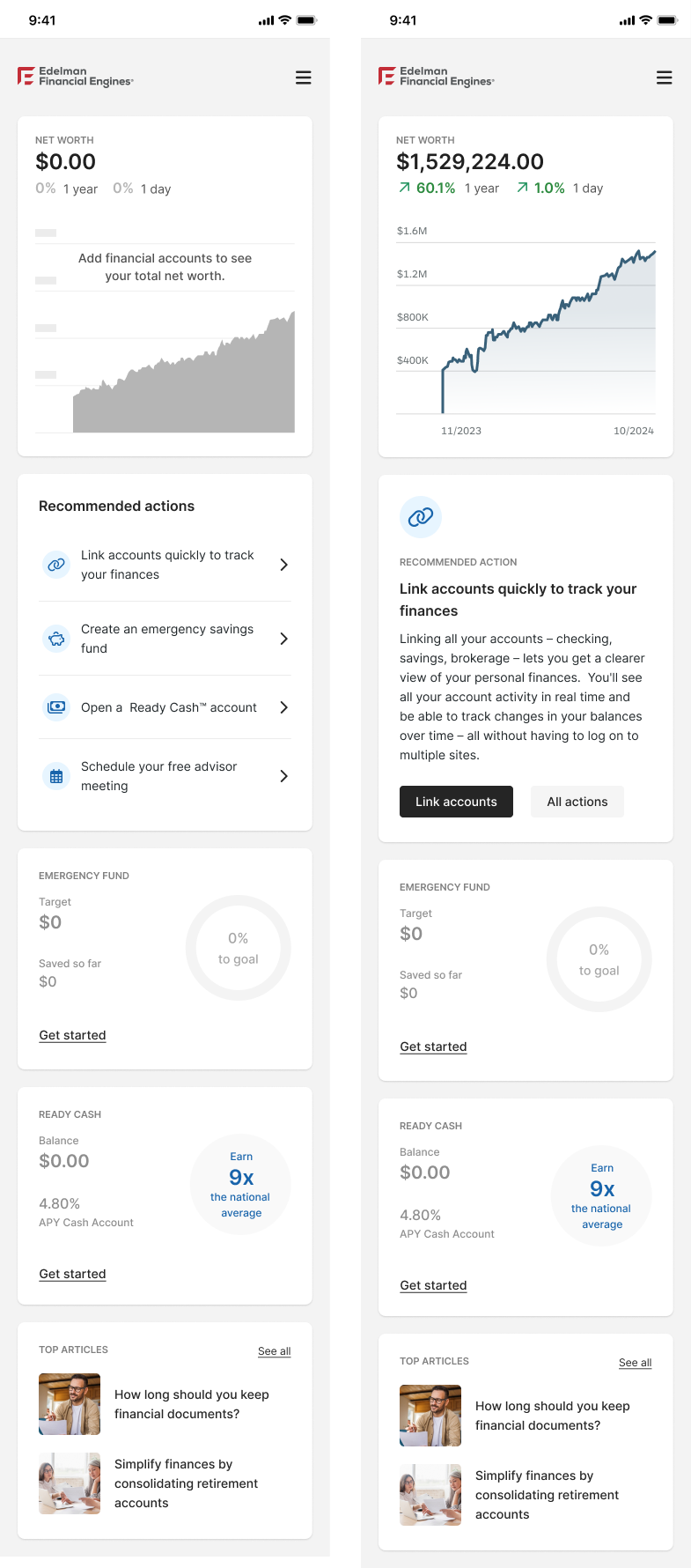 The Edelman Financial Engines Client Portal redesign aimed to modernize the self-service experience for individuals actively building their net worth—especially the 'everyday millionaire.' After the success of the Momentum Financial Wellness Checkup, it became clear that this tech-savvy audience expected more control over their financial tools. The legacy portal lacked basic account management features, creating friction and dependence on financial planners. The new design introduced a seamless, autonomous experience aligned with evolving client expectations.